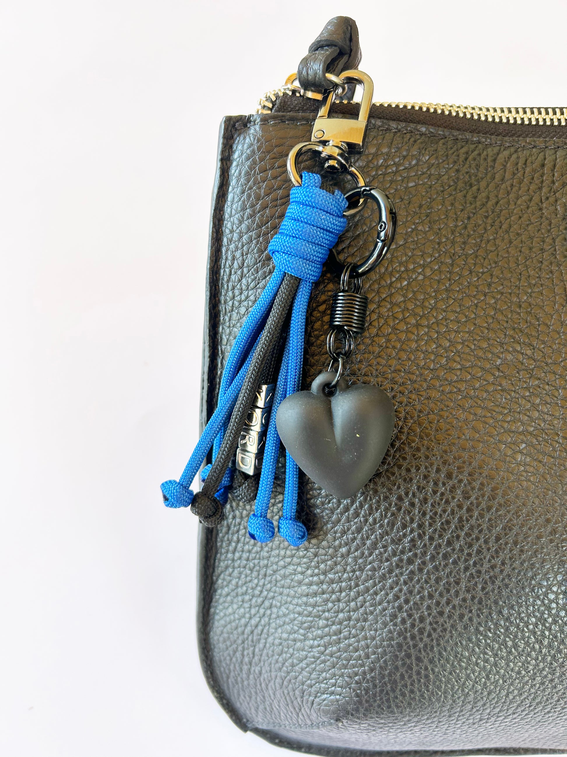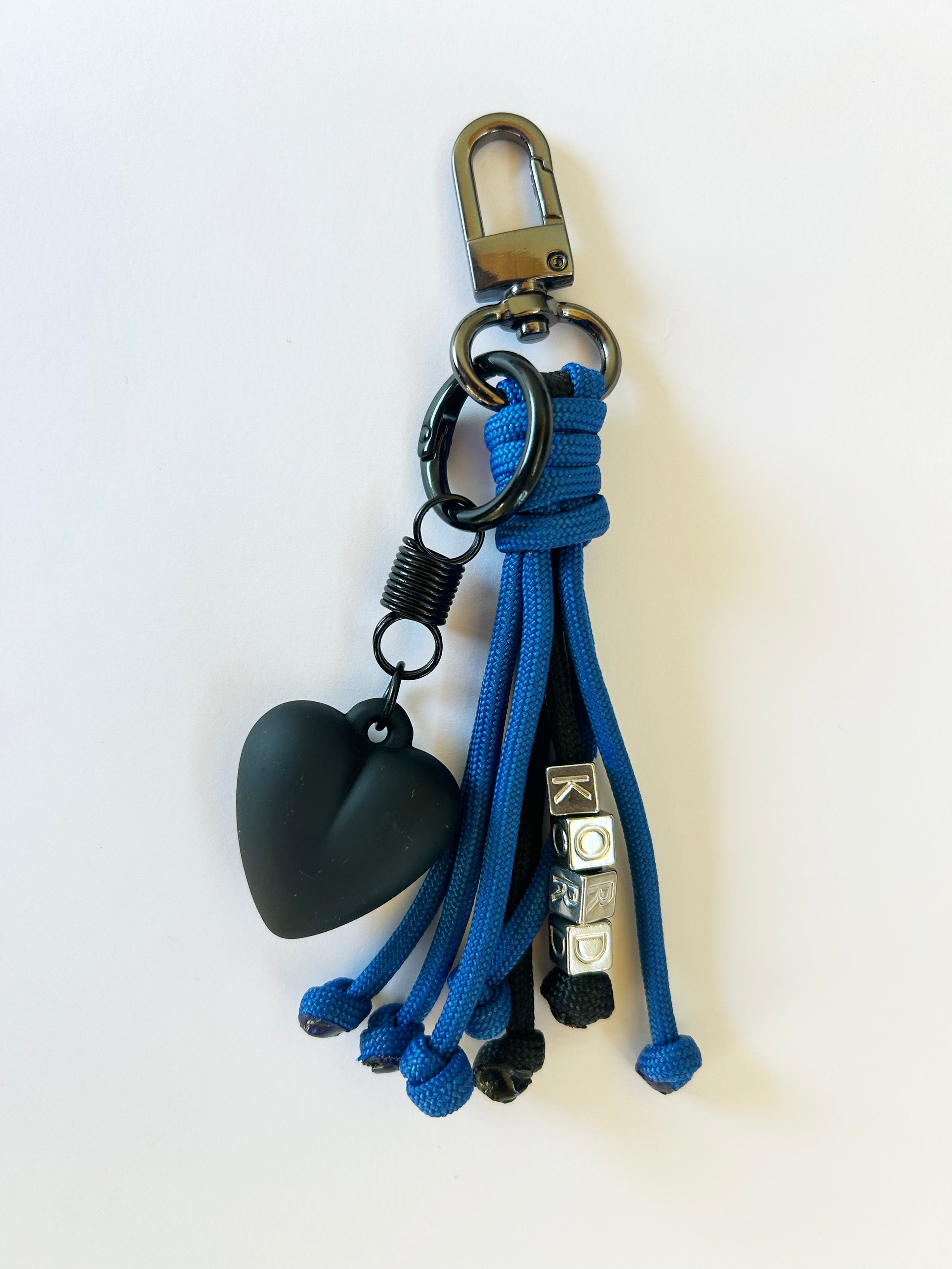 Llavero en paracord azul y negro con herrajes metálicos oscuros y charm de corazón