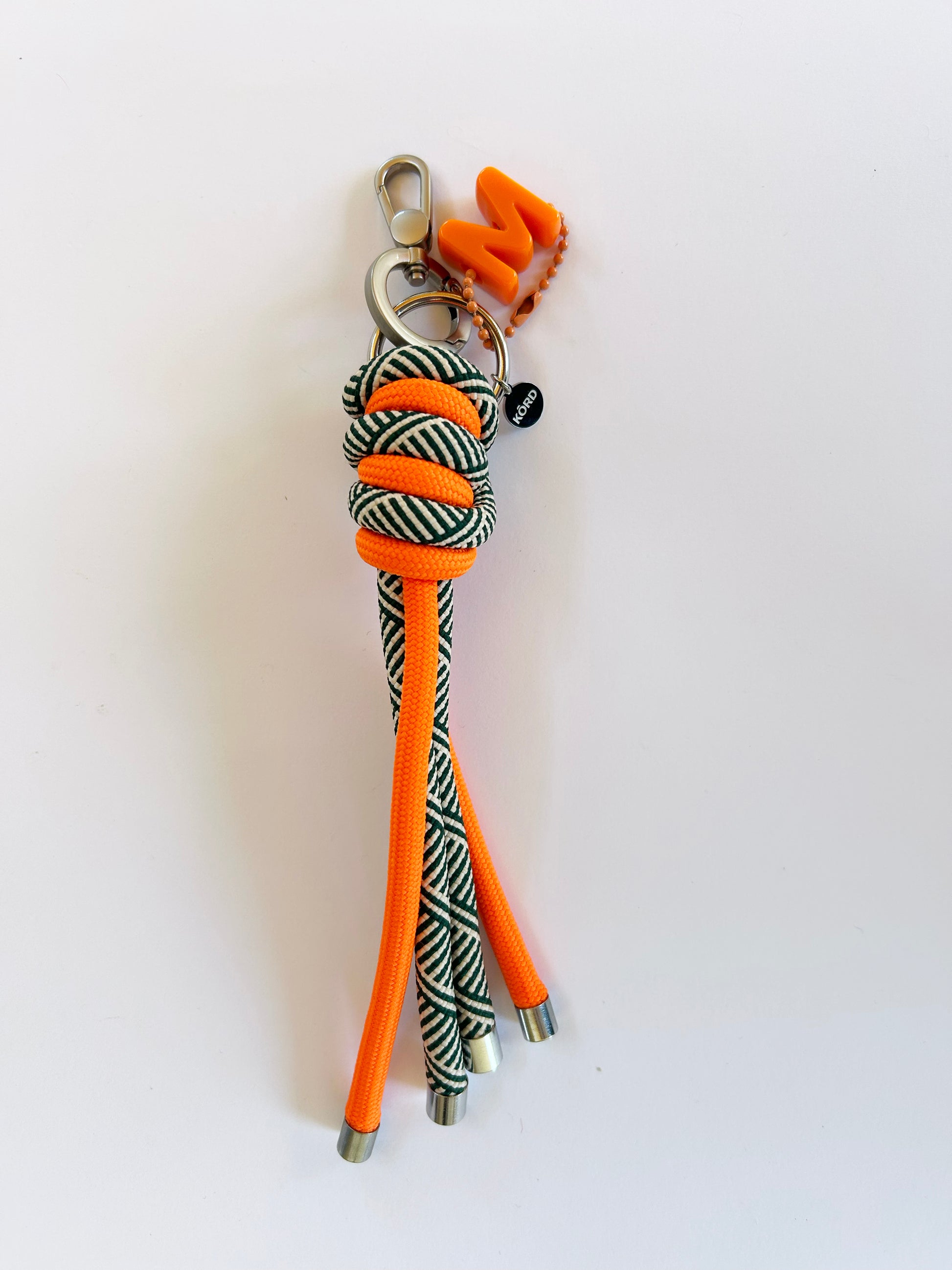 Llavero en paracord bicolor con acentos naranjos y herrajes metálicos con inicial a elección
