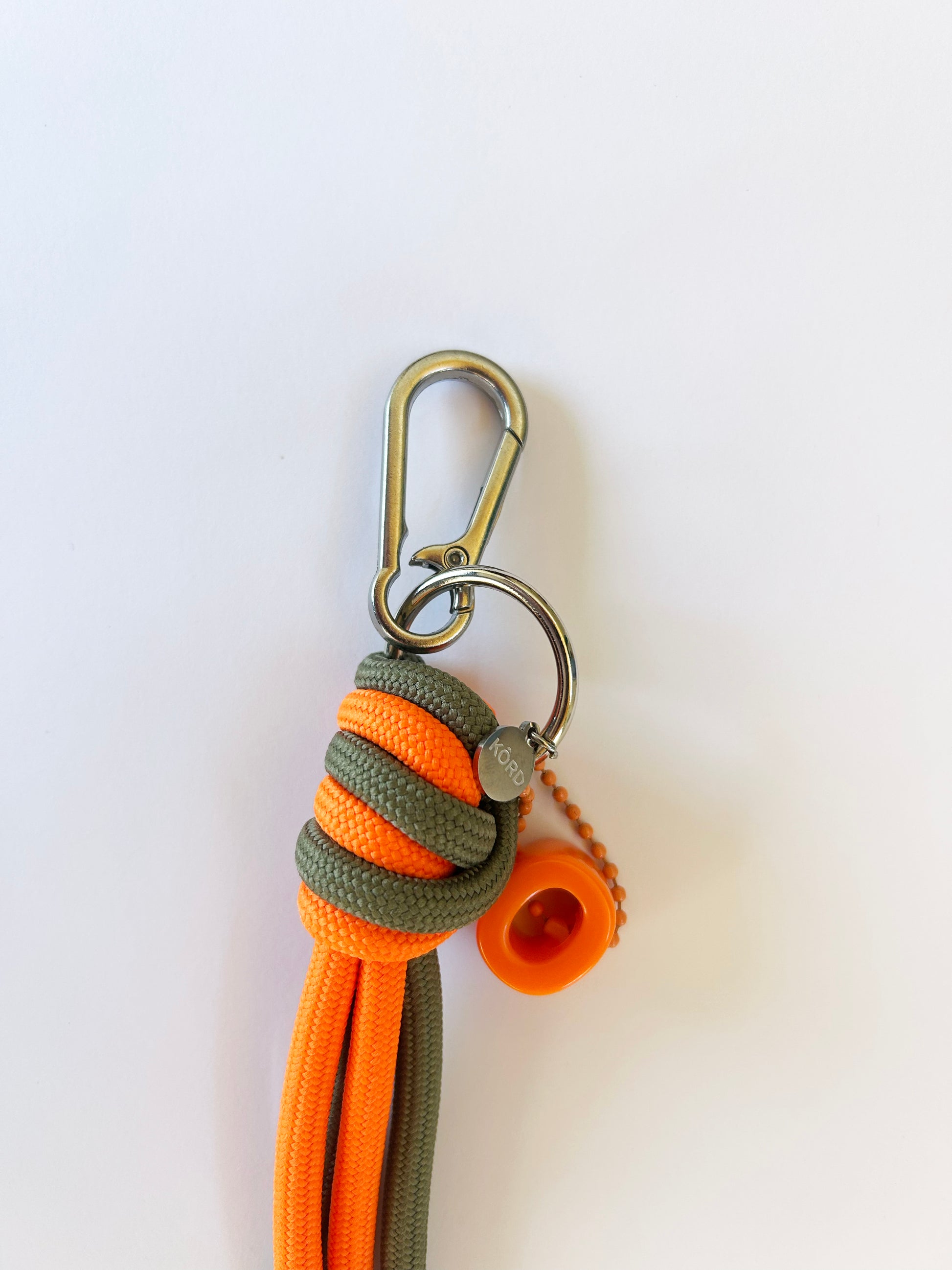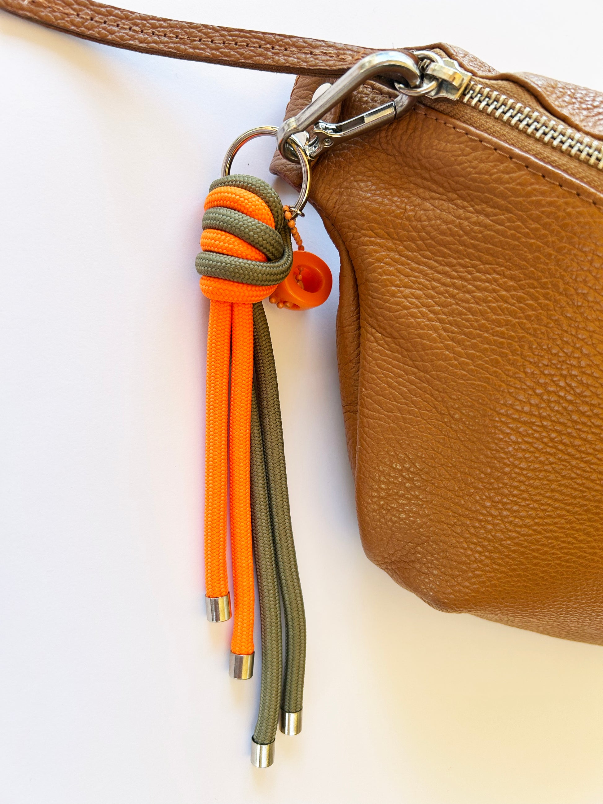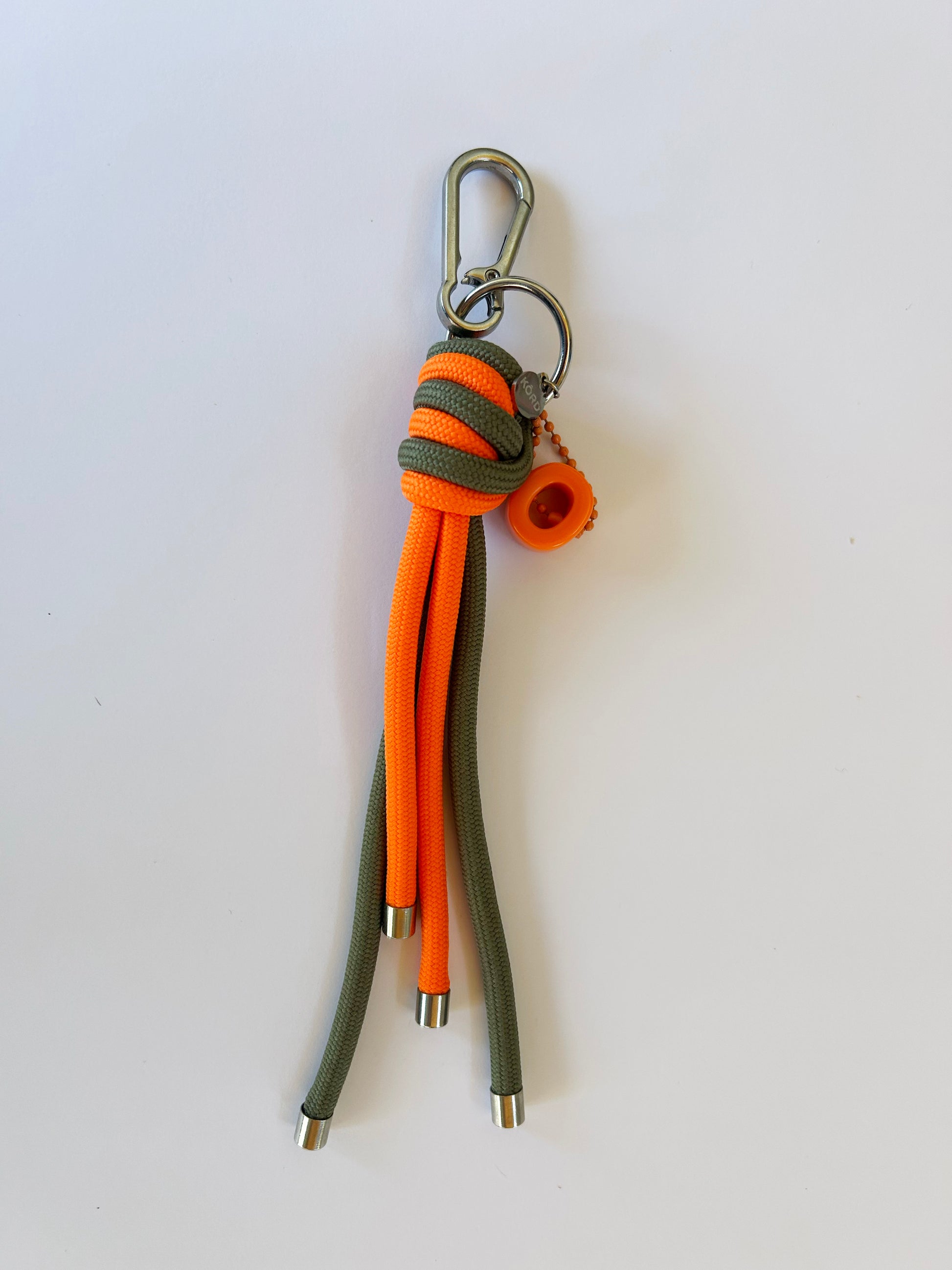 Llavero en paracord naranjo y verde musgo con herrajes metálicos silver