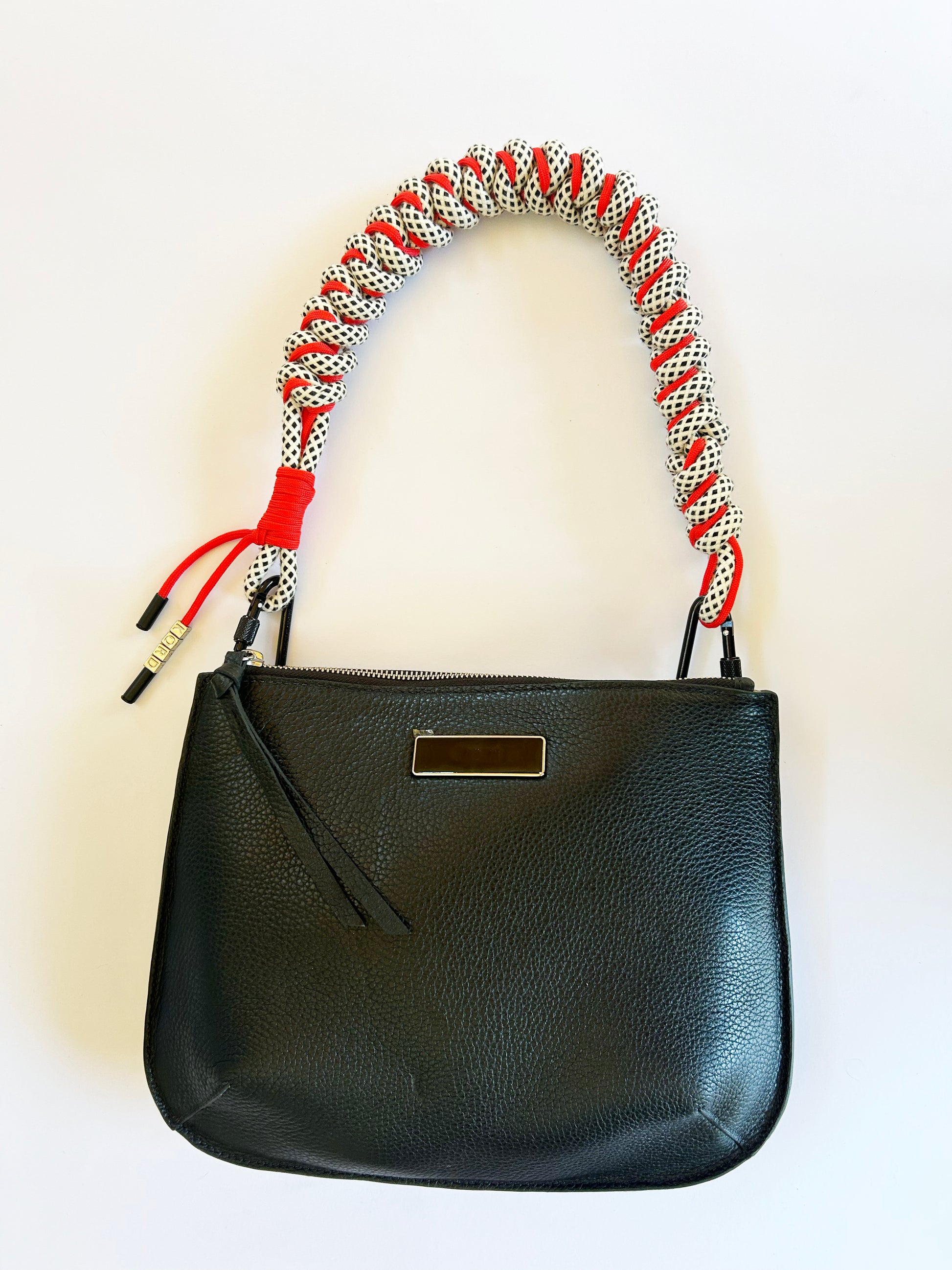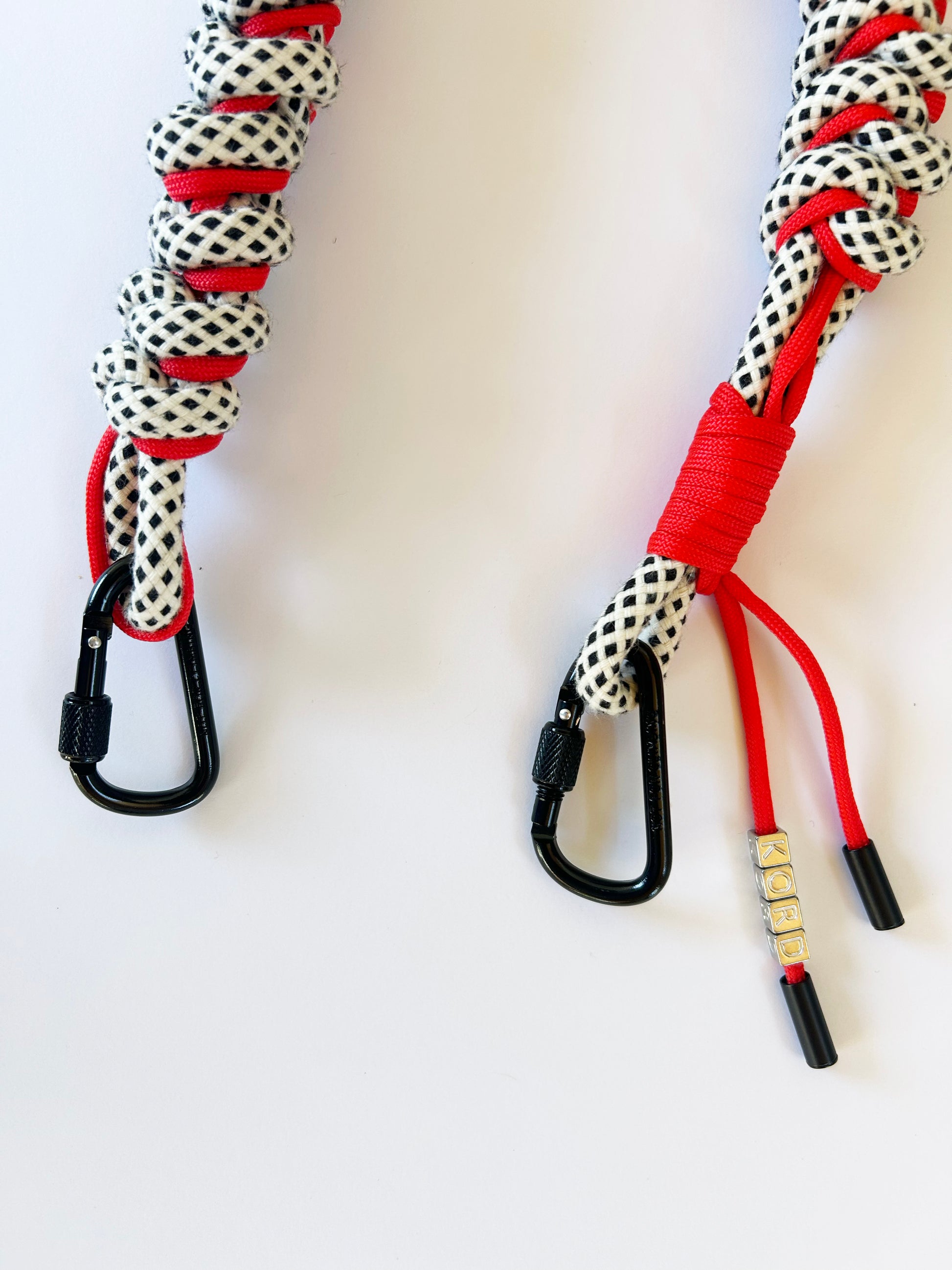 Tirante para cartera en paracord con patrón blanco y negro con acentos rojos y mosquetones negros.