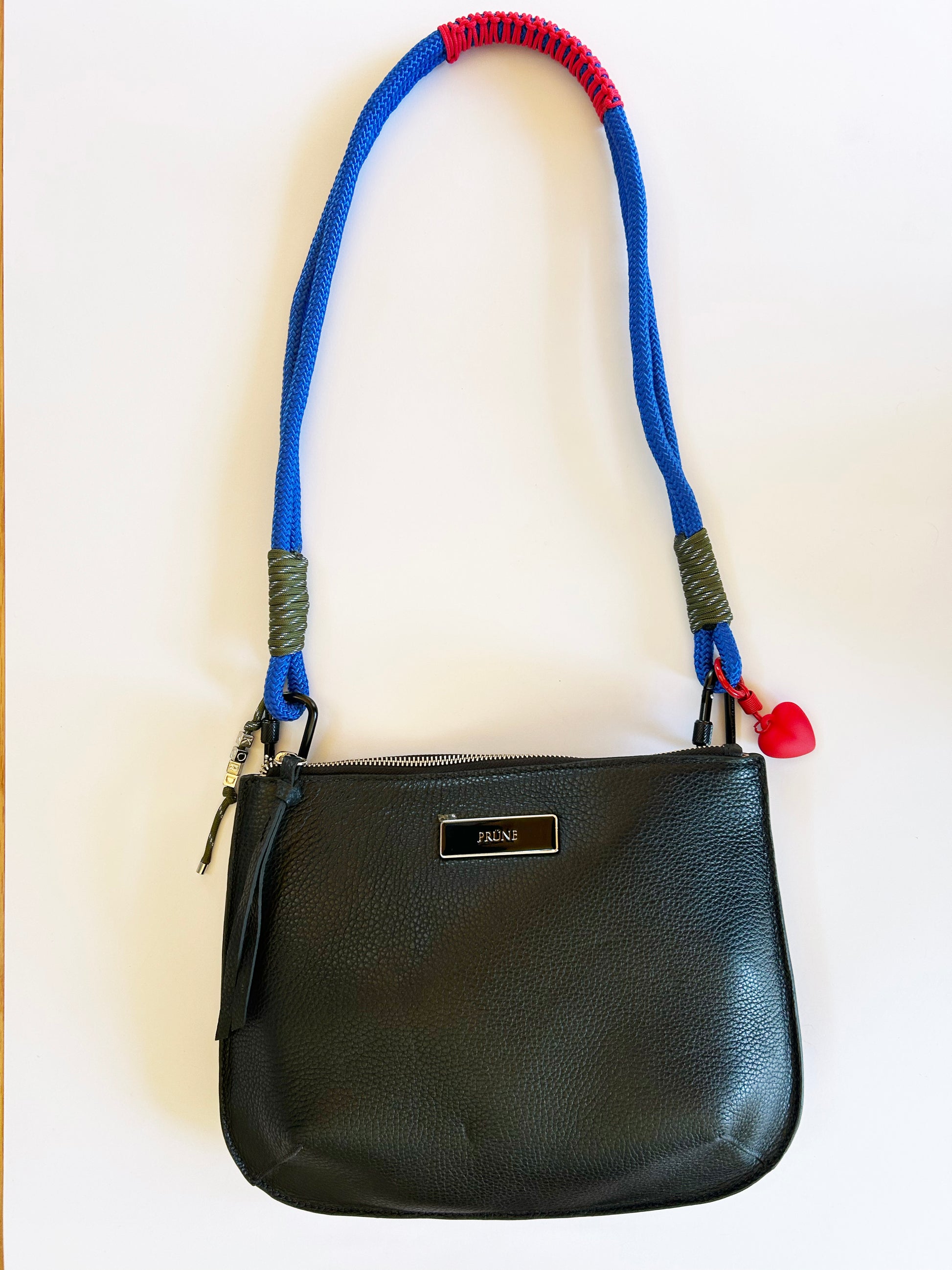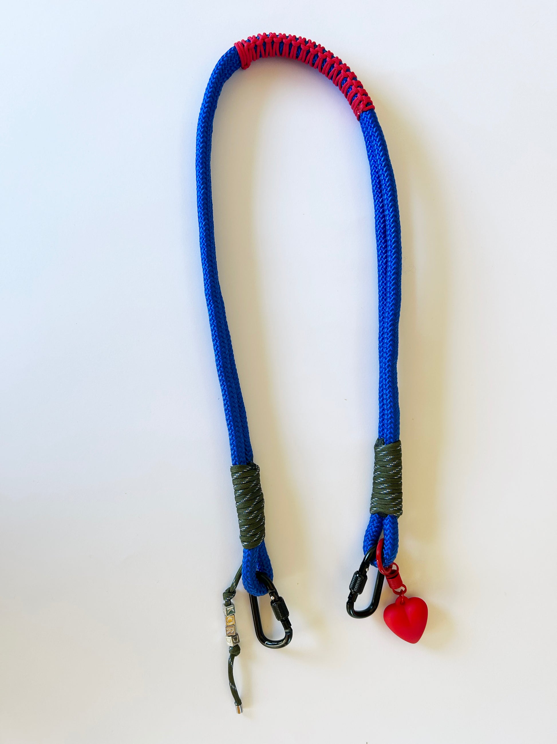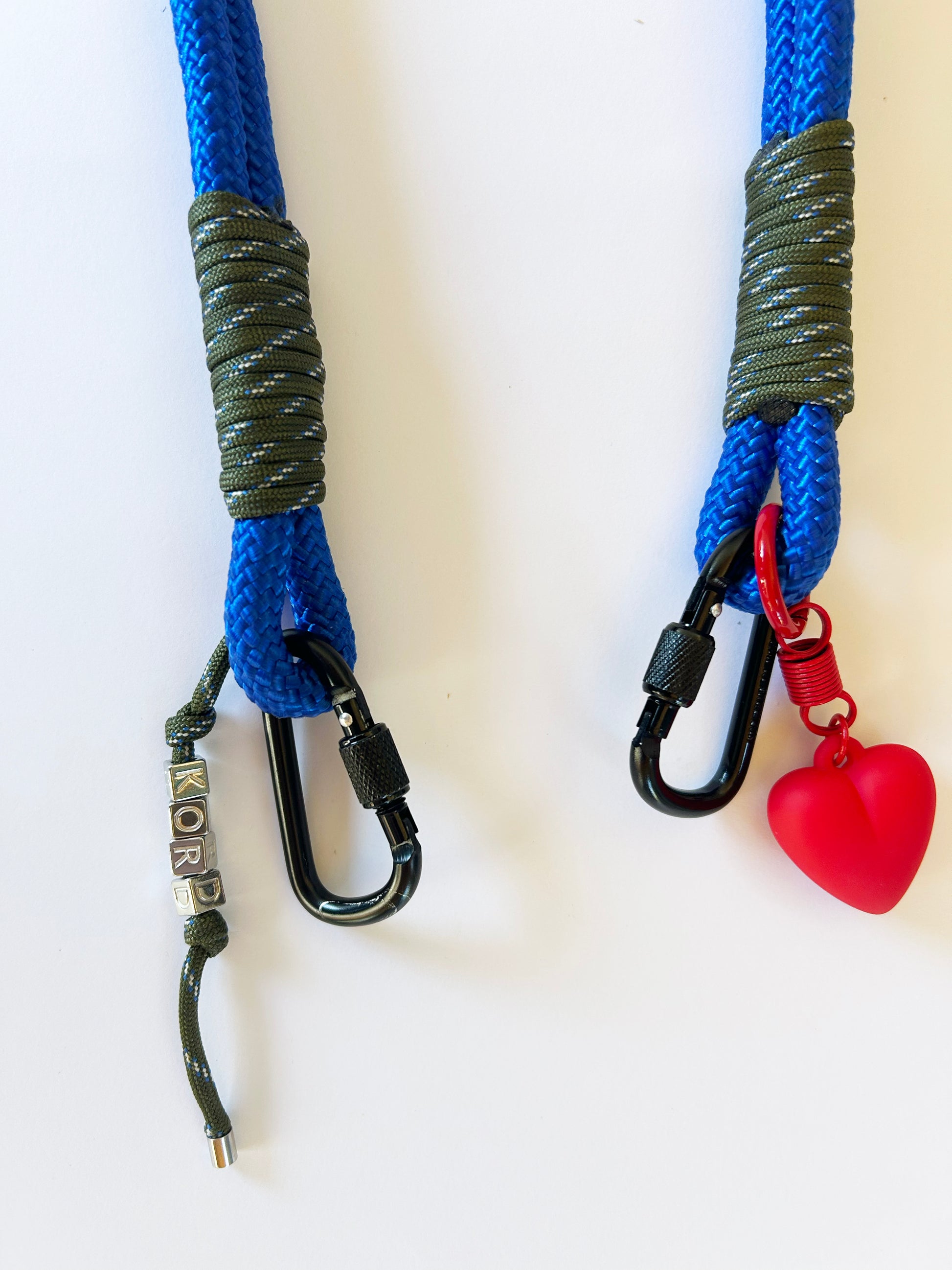Tirante para cartera en paracord azul con detalles rojos y verde oliva , mosquetones negros y charm de corazón rojo